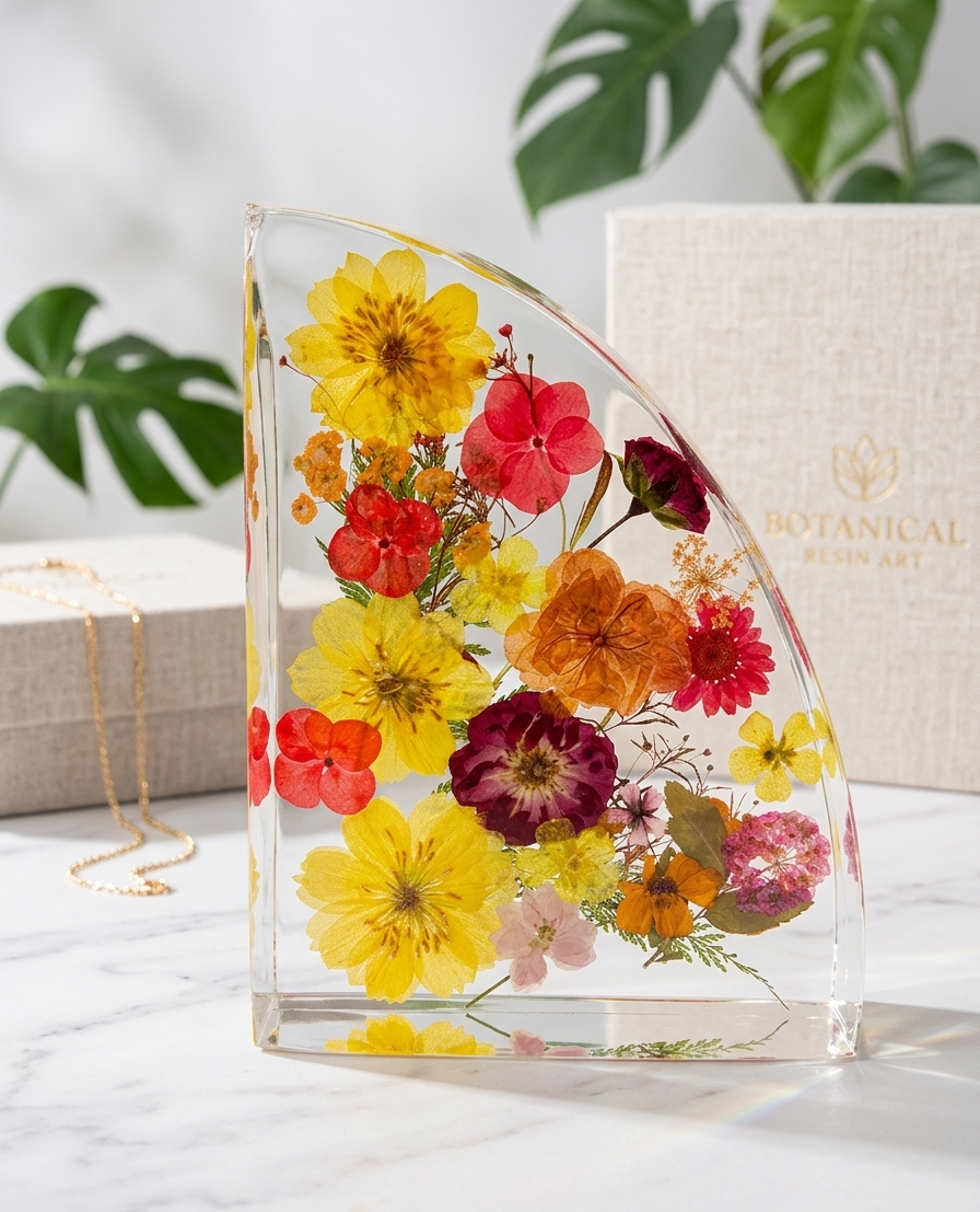 Each set is handcrafted with care. Your flowers are professionally dried, thoughtfully arranged, and encased in crystal-clear, high-end resin to create a one-of-a-kind design that is both elegant and practical.