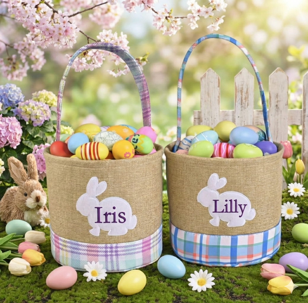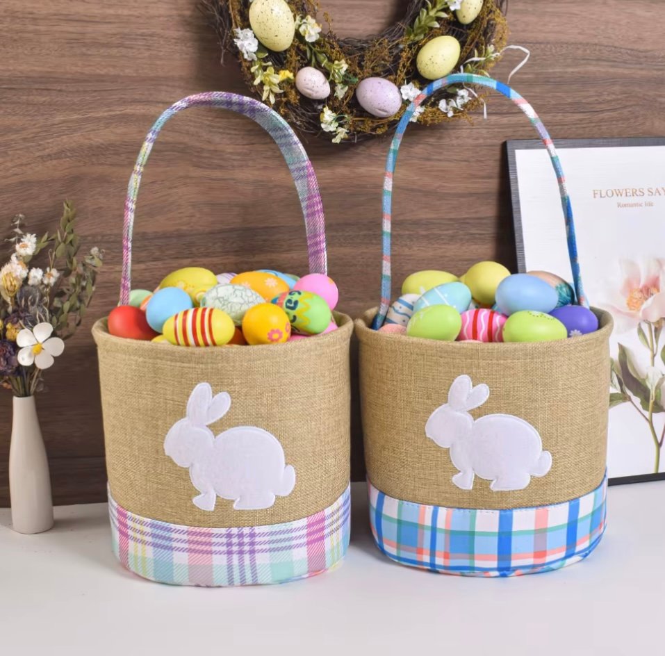Celebrate Easter with these charming fabric Easter baskets, designed to be both festive and reusable year after year. Featuring a soft burlap-style body, pastel patterned trim, and an adorable bunny appliqué, these baskets are the perfect size for Easter eggs, candy, and small gifts.