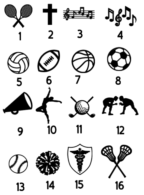 Tennis, Cross, music, music notes, Lacross, Volleyball, football, basketball, soccer, cheer, dance, golf, wrestling, softball, sports medicine and cheer poms