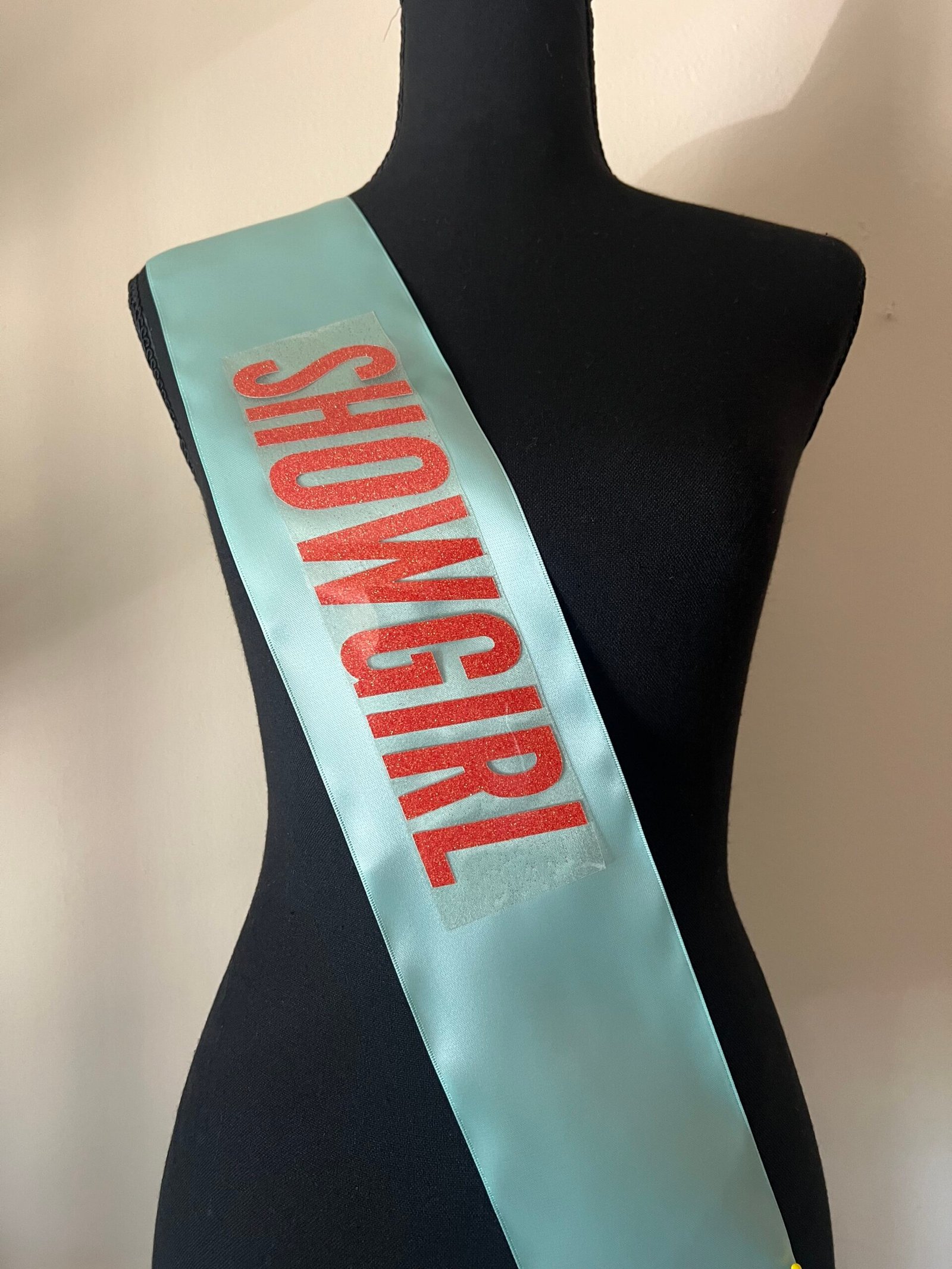 White sash is a thick single faced satin that is 72″ long (36″ folded in half flat), White sash is 4” wide.